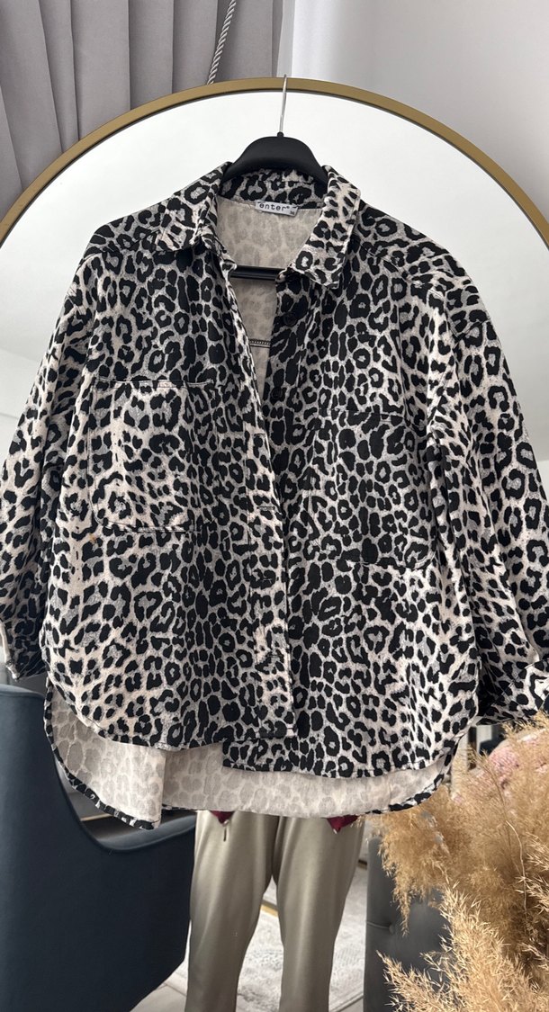 Kadınlar için gri leopar desenli, kürk detaylı, uzun kollu, kısa ve bol kesim gömlek. Sokak stiline uygun yumuşak sentetik kumaştan üretilmiştir.