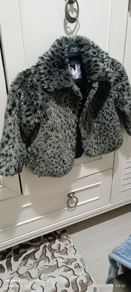 Gri leopar desenli suni kürk, uzun kollu ve yakalıdır. Salaş kesim ve midi boyuyla rahat ve gotik tarzı bir araya getirir.