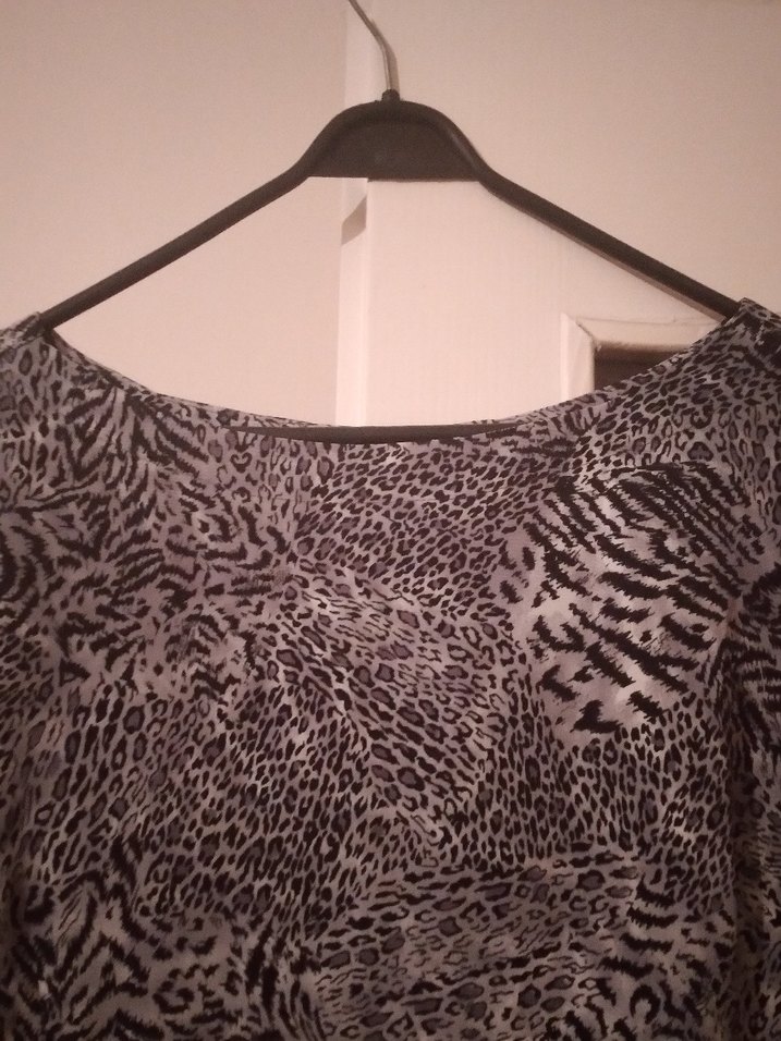Kayık yaka, fakir kol , drapeli tasarıma sahip gri desenli kadın elbise Rahat kesimli ve midi boyda, günlük kullanıma uygun.