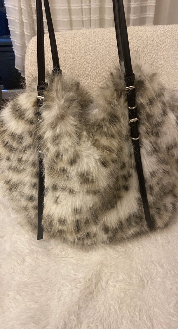 Gri sentetik kumaştan, leopar desenli ve kürk detaylı kadın çantası. Siyah askılarıyla sokak modasına uygun, günlük kullanıma ideal.