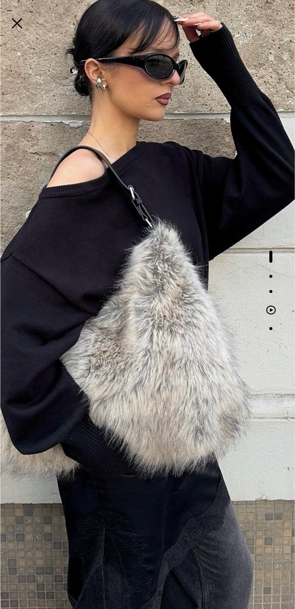 Gri leopar desenli, yumuşak kürk detaylı sentetik kumaştan yapılmış kadın çantası, trend sokak stili için uygundur.