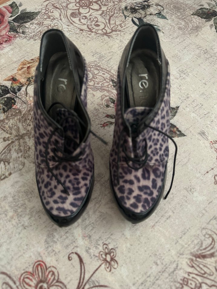 leopar desenli, kürklü detaylara sahip kadın ayakkabısı. Platform topuklu, kauçuk tabanlı ve çağdaş sokak stili sunar.