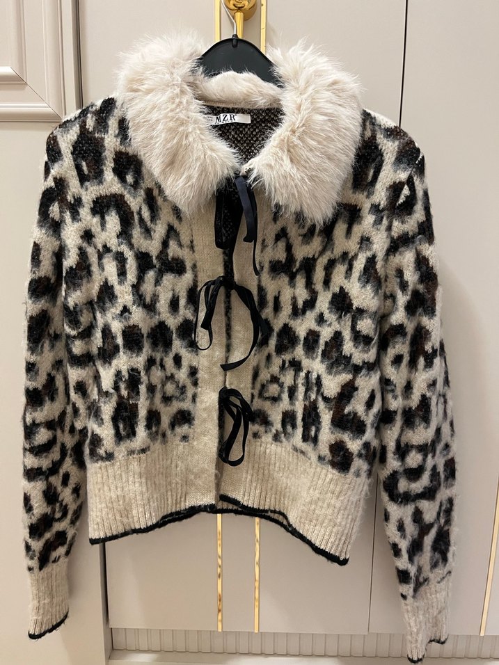 Bej tonlarda leopar desenli, kürklü yakalı, uzun kollu, normal midi boyda, triko kumaştan yapılmış, fitted kesim hırka. Marka temsilidir.S M L uygundur.