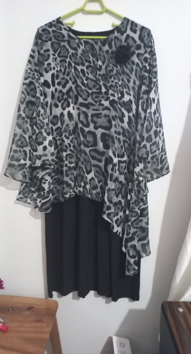 Gri leopar desenli, yüksek yakalı, kolsuz, uzun ve dökümlü elbise, yumuşak sentetik kumaştan üretilmiştir.