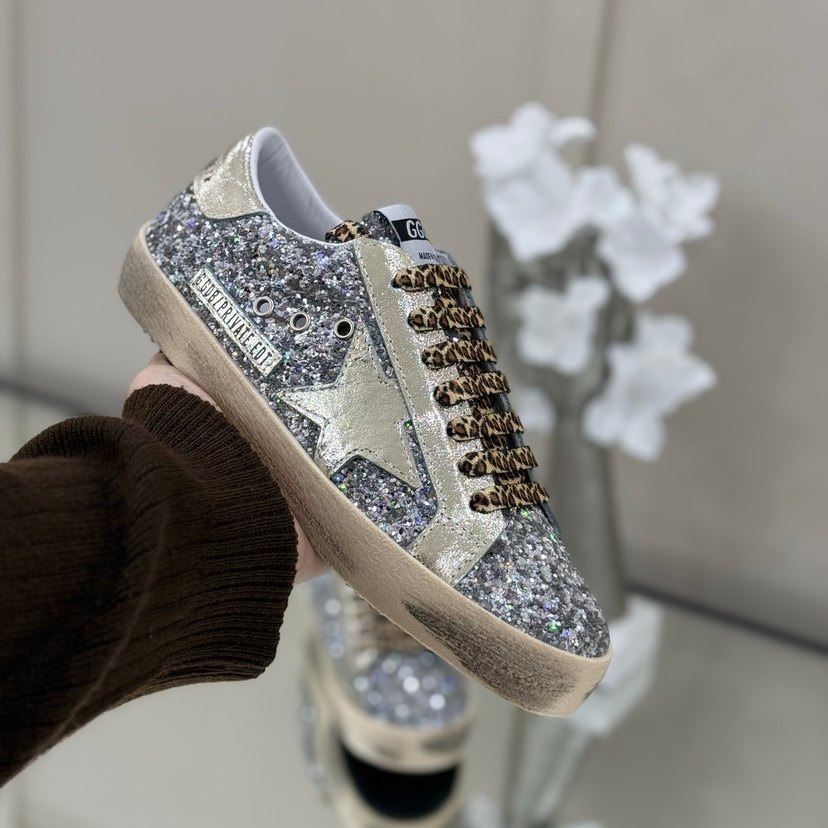 Gri renkte, payetli ve leopar desenli bağcıkları olan yüksek topuklu spor ayakkabılar, sokak modasını athleisure rahatlığıyla birleştirir. Kauçuk taban günlük kullanıma uygundur. ✨