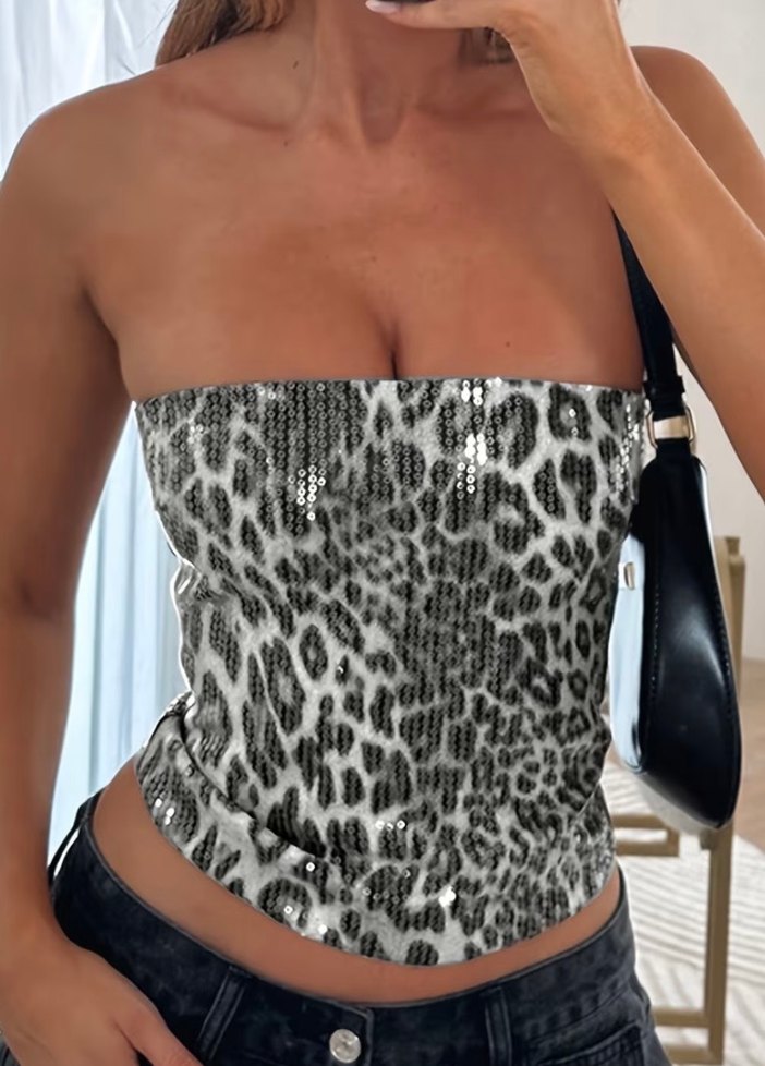 Gri leopar desenli pullu straplez crop