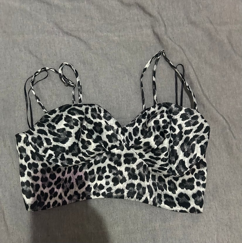 Sıkı kesim, gri leopar desenli bustiyer, ince askılı ve tokalı detaylı. Kısa boy, sokak modasına uygun.