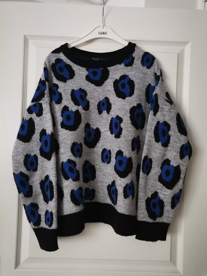Gri renkli, mavi leopar desenli triko kadın kazak. Uzun kollu, yuvarlak yakalı ve bol kesim. Yumuşak ve sıcak kumaştan, rahat sokak stili için uygundur.