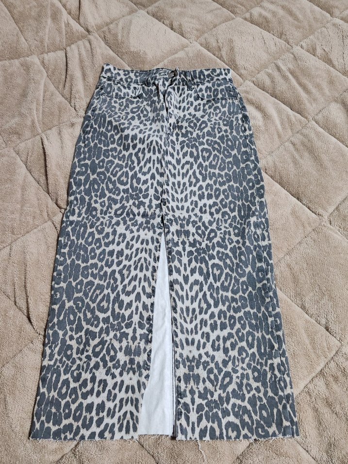 Gri leopar desenli, kürk detaylı ve sentetik kumaştan yapılmış, vücuda oturan uzun etek. Günlük kullanıma uygun, trend ve rahat tarzda.