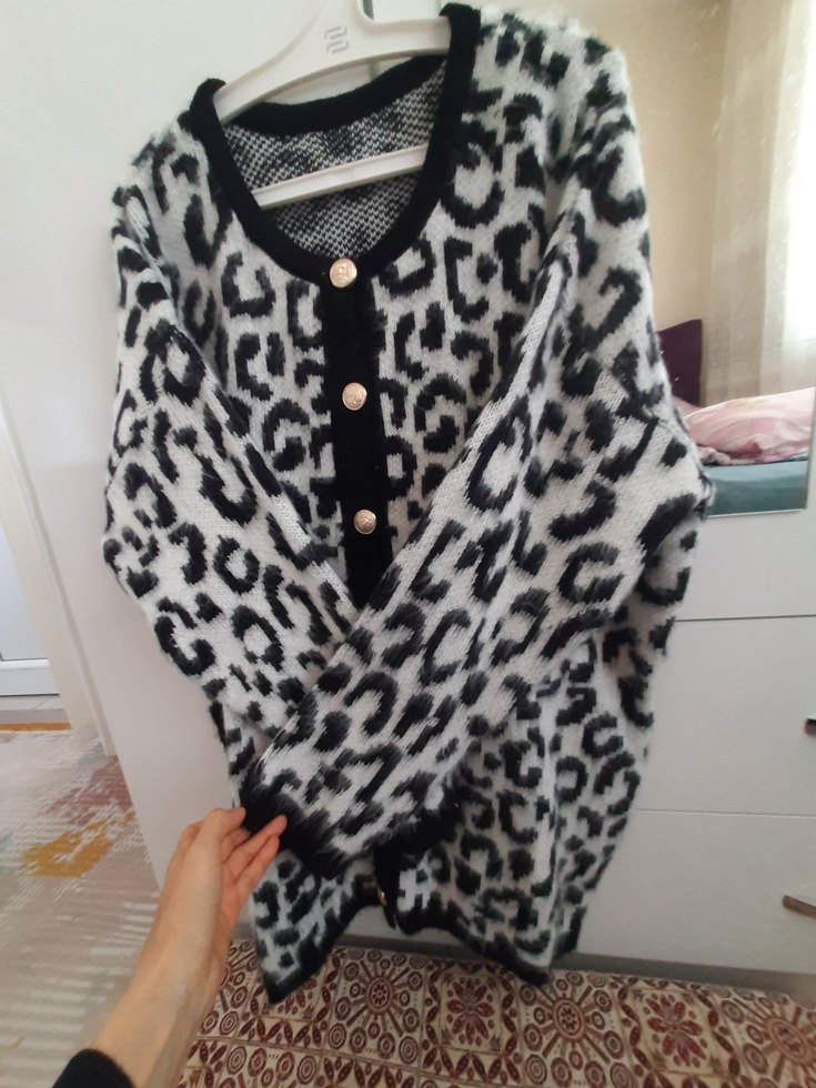 Gri leopar desenli, düğmeli, uzun kollu, yuvarlak yakalı, midi uzunlukta ve bol kesim triko kadın hırka.
