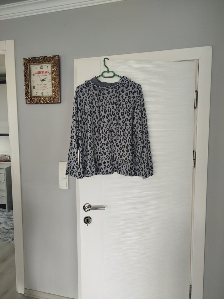 Gri leopar desenli, uzun kollu, bol kesim, yuvarlak yaka kadın bluz. Örme sentetik kumaştan, günlük rahat stil için uygun.