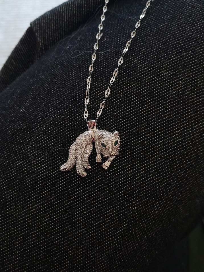 Uzun zincirli, gri renkte ve leopar figürlü, parlak taşlarla süslü kolye, günlük sokak stiline ışıltılı bir dokunuş katıyor.