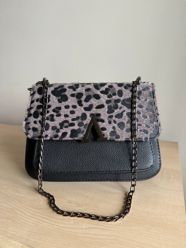 Gri deriden yapılmış, leopar desenli kapak ve zincir askıya sahip, çağdaş tasarımlı ve günlük kullanıma uygun şık çanta.