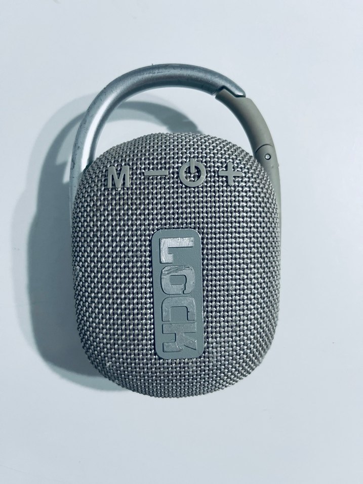 Gri LOCK Bluetooth hoparlör, entegre ses ve mod kontrolleri ile kompakt tasarıma sahip. Kolay takma için dahili karabina içerir. Sağlam Çalışır durumda