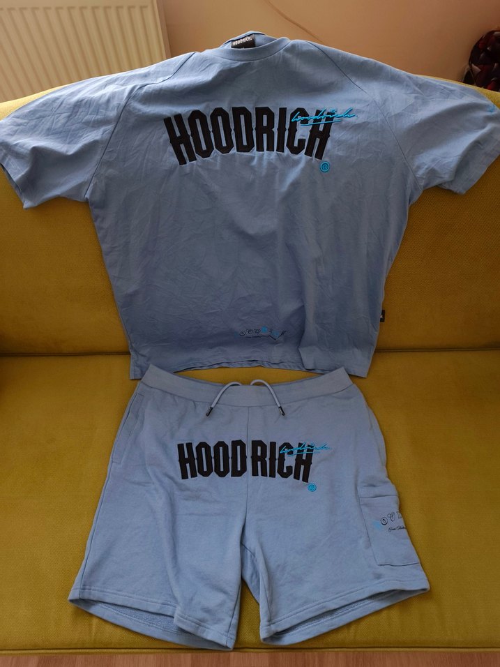 Gri denim erkek çocuk sweatshirt ve şort takımı, loose fit ve bisiklet yaka ile. Üzerinde 'HOODRICH' baskısı bulunan, streetwear tarzda rahat bir set.