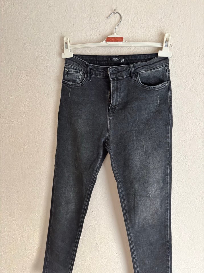 Gri renkli, loose fit kesime sahip normal boy kadın denim pantolon, gündelik kullanıma uygun sade ve rahat bir stil sunar.