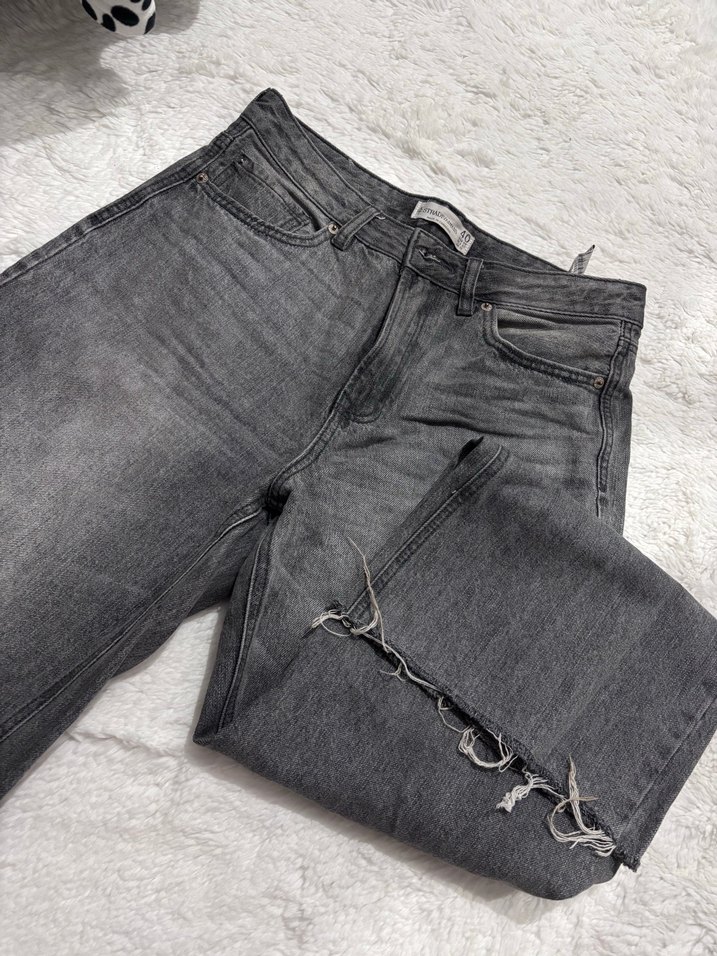 Gri renkli, loose fit kesim kadın denim pantolon. Tokalı detaylı, midi boyda ve sade desensiz tasarım. Günlük kullanıma uygun.