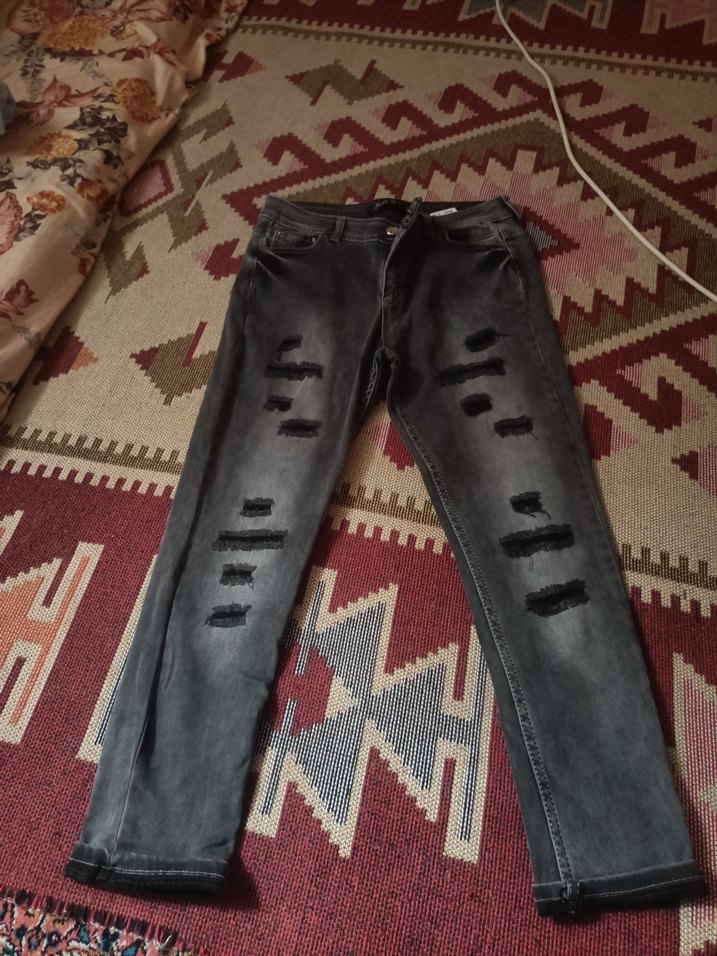 Gri renkli, loose fit kesim, yırtık detaylı ve tokalı kadın midi boy jean. Günlük sokak stiline uygun.