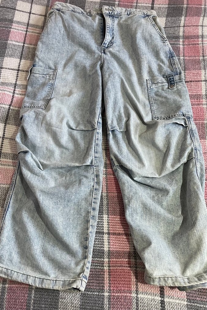 Gri renkli, kemerli, bol kesim midi boy kadın denim pantolon. Çoklu cepleriyle rahat ve günlük kullanım için uygun.