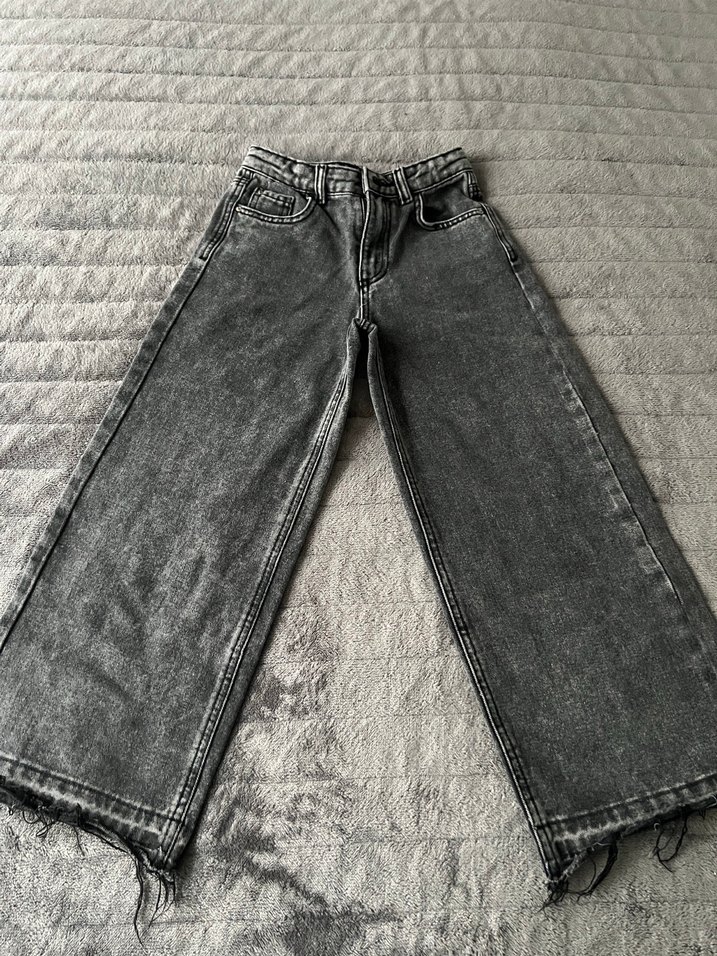 Gri renk, loose fit, midi boy, kot kumaş pantolon. Ham kenarlı, desen içermeyen rahat ve günlük kullanıma uygun. 8-9 yaş paçası kendinden kesik tertemiz jean