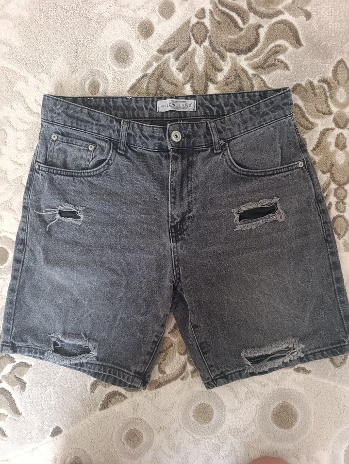 Gri renk, loose fit kesim mini denim şort, tokalı detayları ve yırtık desenleri ile günlük sokak stiline uygundur.