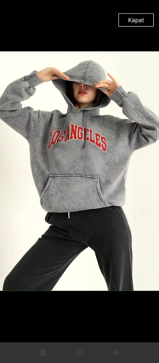 Gri renkte, Los Angeles baskılı, kapüşonlu sweatshirt. Bol kesim, yuvarlak yaka ve uzun kollu, yumuşak ve sıcak kumaştan üretilmiştir.