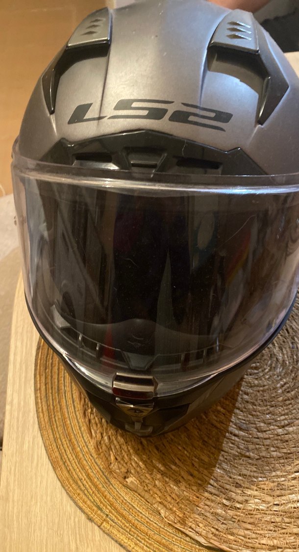 Gri renkli LS2 marka, metal malzemeden yapılmış, tokalı kapama ve şeffaf vizöre sahip biker kask. Sokak stiline uygun, rock punk havasında. ️L beden