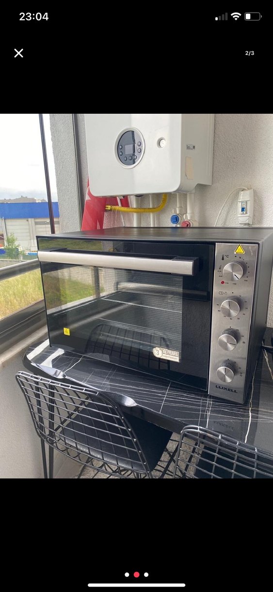 Gri renkli Luxell mini fırın, şeffaf kapak ve dört ayar düğmesine sahiptir. Küçük mutfak tezgahlarına uygundur.