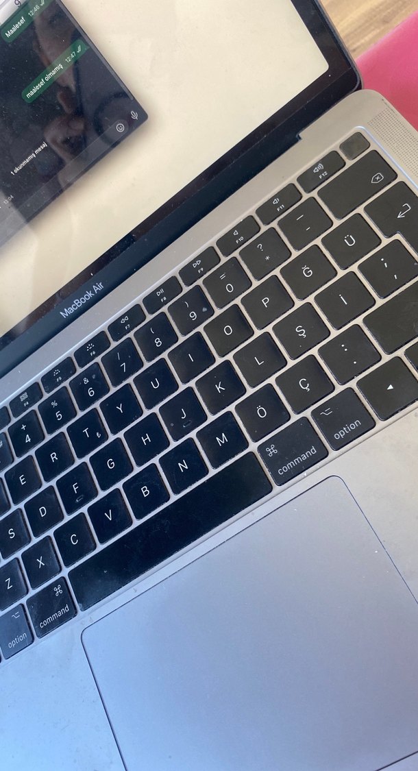 Türkçe klavyeye sahip gri MacBook Air dizüstü bilgisayar, şık tasarım ve kompakt boyutta.