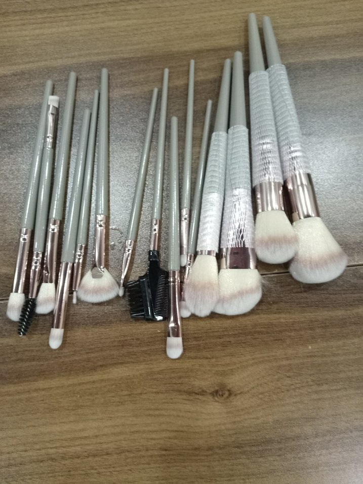 Farklı boyut ve şekillerde, yumuşak kıllı ve dokulu saplı gri makyaj fırça seti. ️15 adet makyaj fırçası seti.