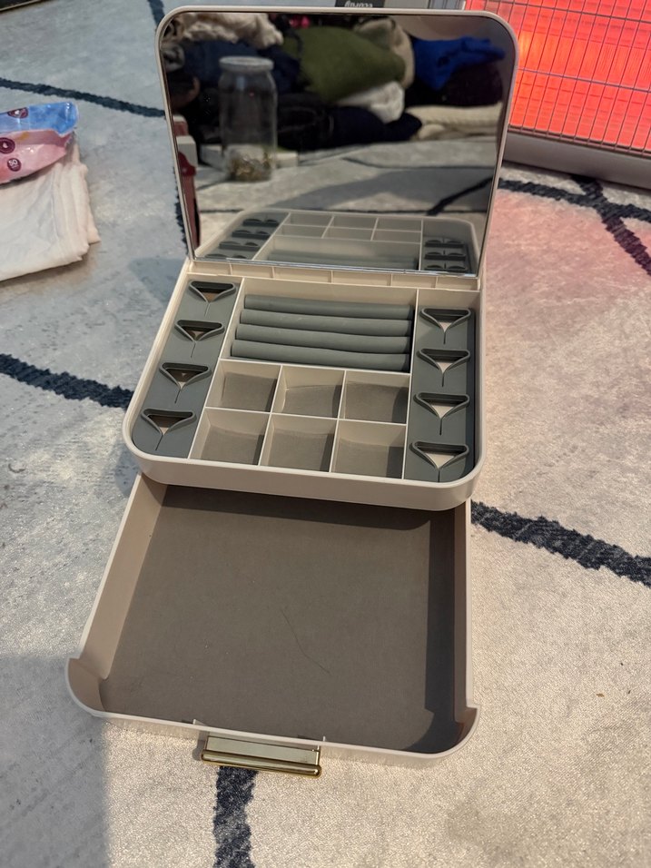 Gri renkli makyaj organizeri, çeşitli bölmeler ve yerleşik aynası ile çekmeceli ekstra depolama alanı sunar. Makyaj malzemelerini düzenli tutar.