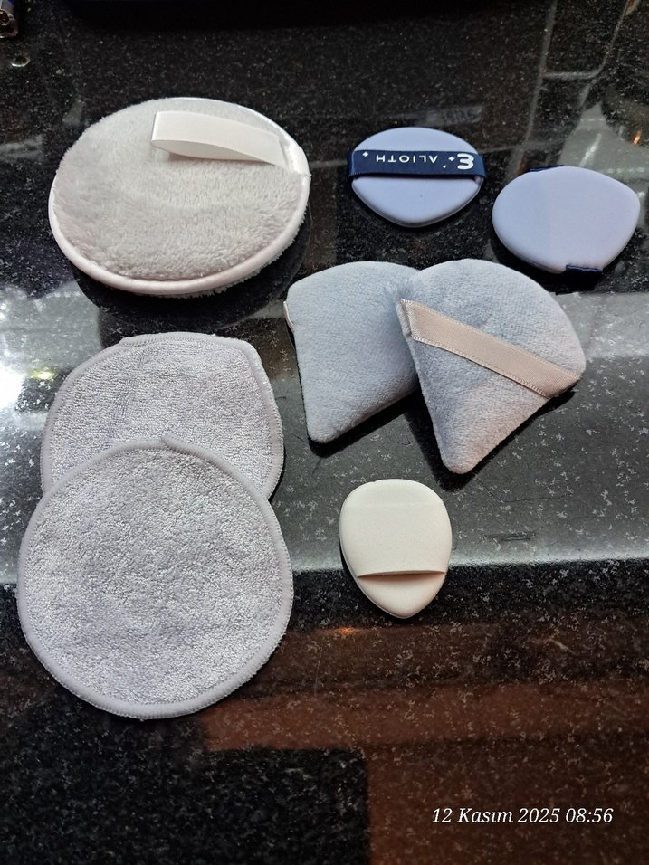 Makyaj uygulaması için farklı şekillerde gri süngerler ve pedlerden oluşan set. Görüntüde 12 Kasim 2025 08:56 tarihi yer alıyor.