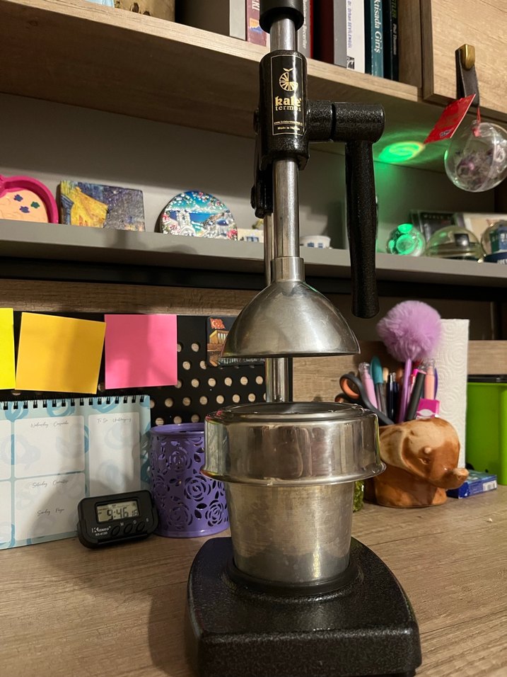 Gri renkte, sağlam metal pres ve tabana sahip manuel meyve sıkacağıdır. Kol yardımıyla kolay kullanılır.