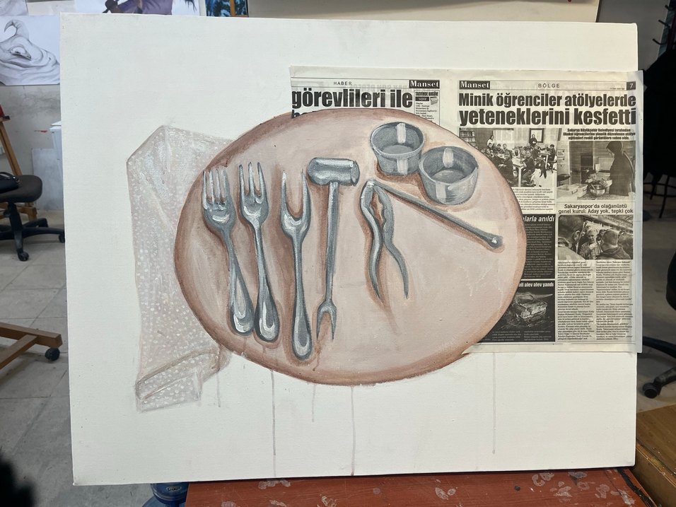 Gri renkte, çatallar, çekiç, pense ve küçük kaplardan oluşan sade, karşı kültür tarzında masa üstü tabak seti tablo