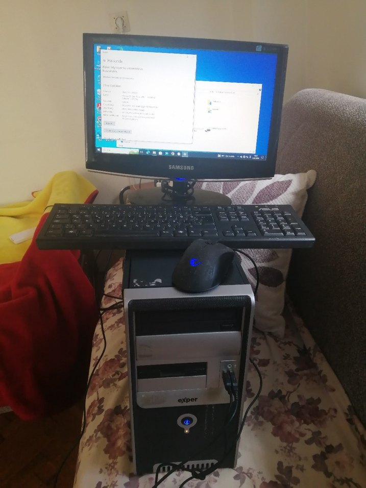 Samsung monitör, klavye ve fare ile gri masaüstü bilgisayar seti. Ön USB portları ve güç düğmesi bulunan kasa, genel bilgisayar işleri için uygundur. ️