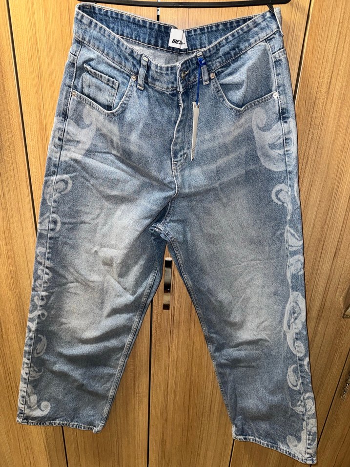 Gri tie-dye desenli, bağcıklı detaylara sahip mavi salaş kot pantolon, günlük rahat kullanım için uygundur.