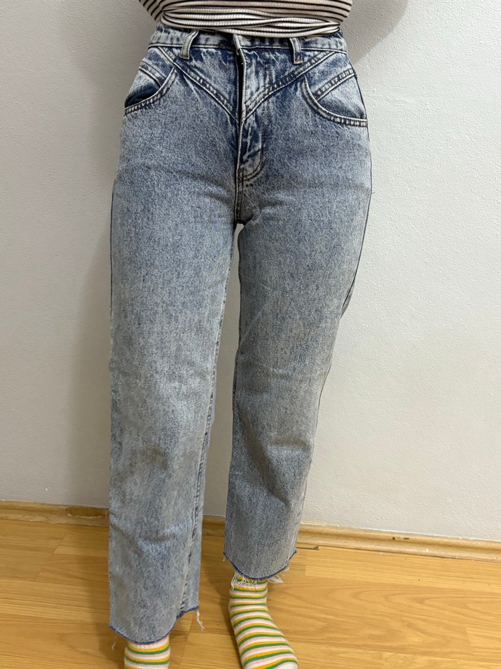 Gri mavi bağlama desenli kot, bol kesimi ve midi boyuyla rahat sokak modası tarzı sunar, günlük kullanım için şık ve konforludur.