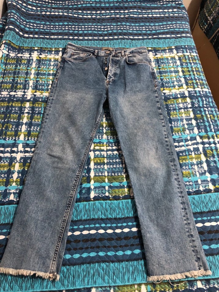 Gri-mavi bağlamalı denimden, regular fit kesim, bağcıklı ve püsküllü kenar detaylı kadın jean, günlük kullanım için uygun.
