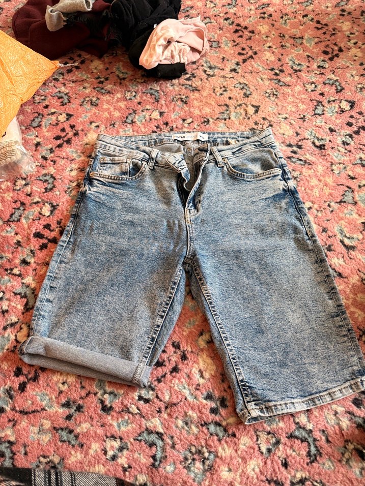 Gevşek kesim, bağlamalı detaylı kadın kot şort. Gri ve mavi tie-dye deseni ile kısa ve mini uzunlukta, günlük rahat sokak stili için uygundur.