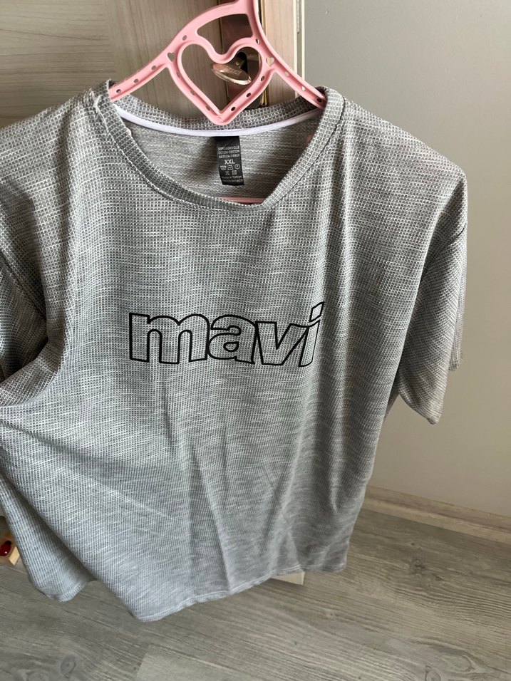 Gri renkli, kısa kollu ve yuvarlak yaka erkek tişörtü, baskılı "mavi" logosu ve cırt cırt detayına sahiptir. Rahat tekstil kumaşından üretilmiştir.
