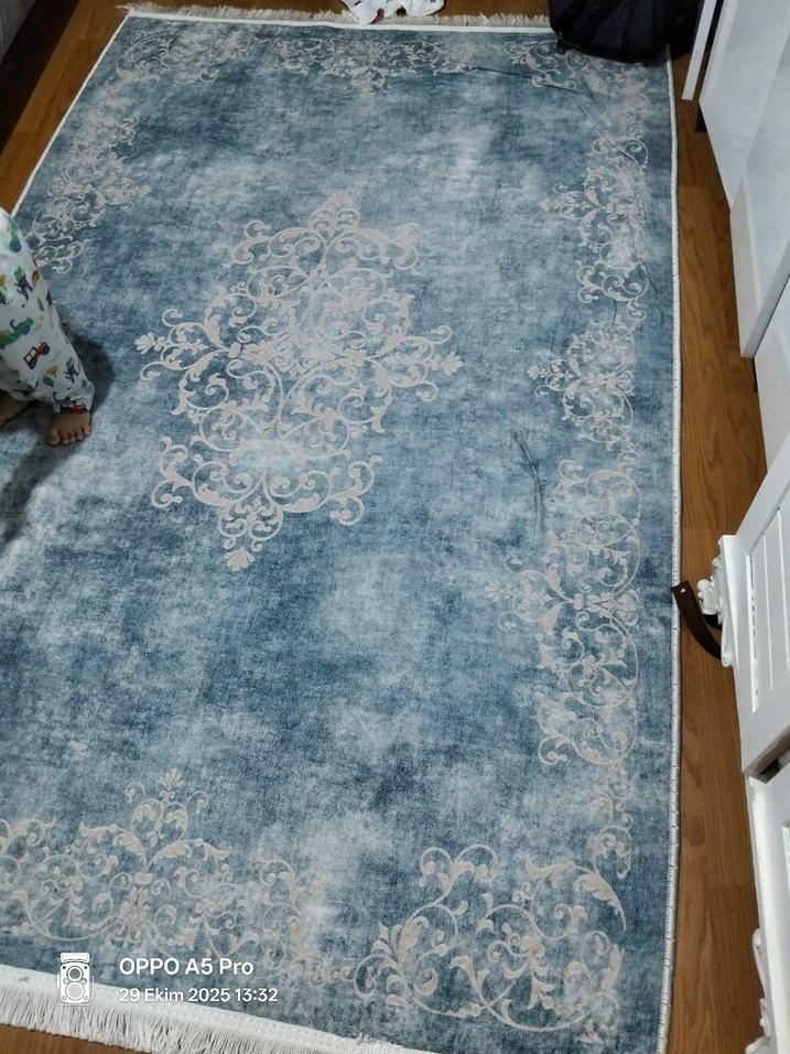 Gri ve mavi tonlarda baskılı desene sahip klasik tarzda bir halı, zarif bir dekoratif dokunuş sunar. 3 m2