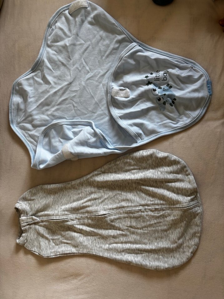 Gri pamuklu kumaştan yapılmış bebek kundak uyku tulumu, rahat uyku sağlar.