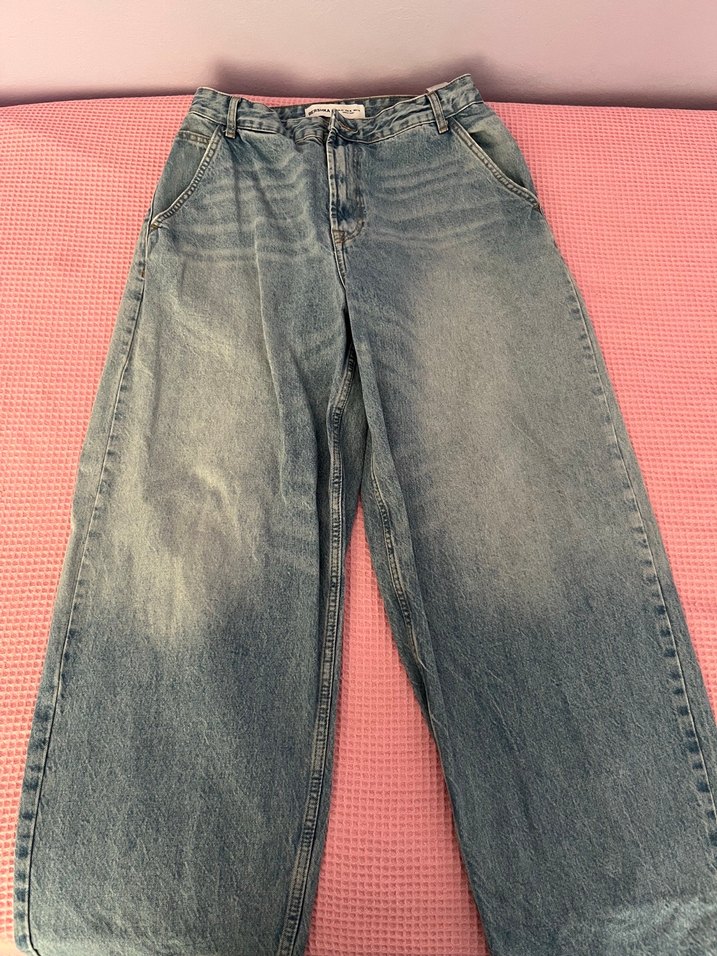 Gri mavi tonlarında, bol kesim ve normal boyda kadın denim pantolon. Rahat ve şık bir görünüm sunar, günlük kullanıma uygundur.