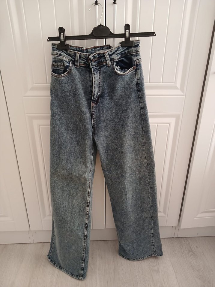 Bol kesim ve kemerli, gri mavi tonlarında yumuşak denim kumaştan üretilmiş kadın kot pantolon. Günlük kullanıma uygun streetwear tarzında.