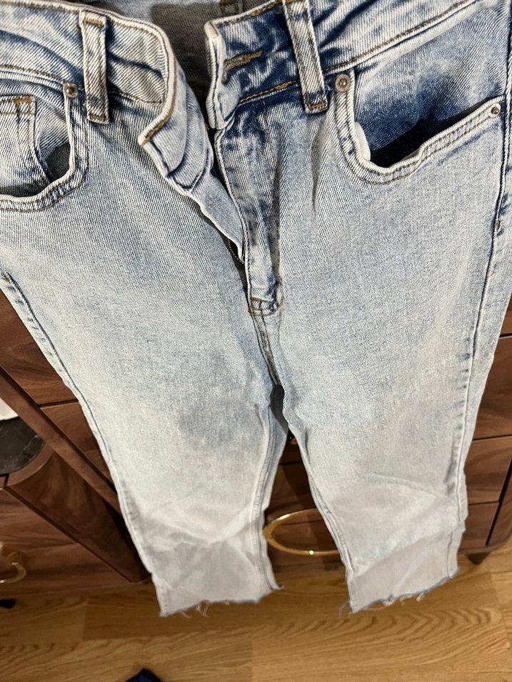 Gri mavi tonlarda, bol kesim ve tokalı detaylı kadın kot pantolon. Normal midi boyda, günlük sokak stiline uygun.