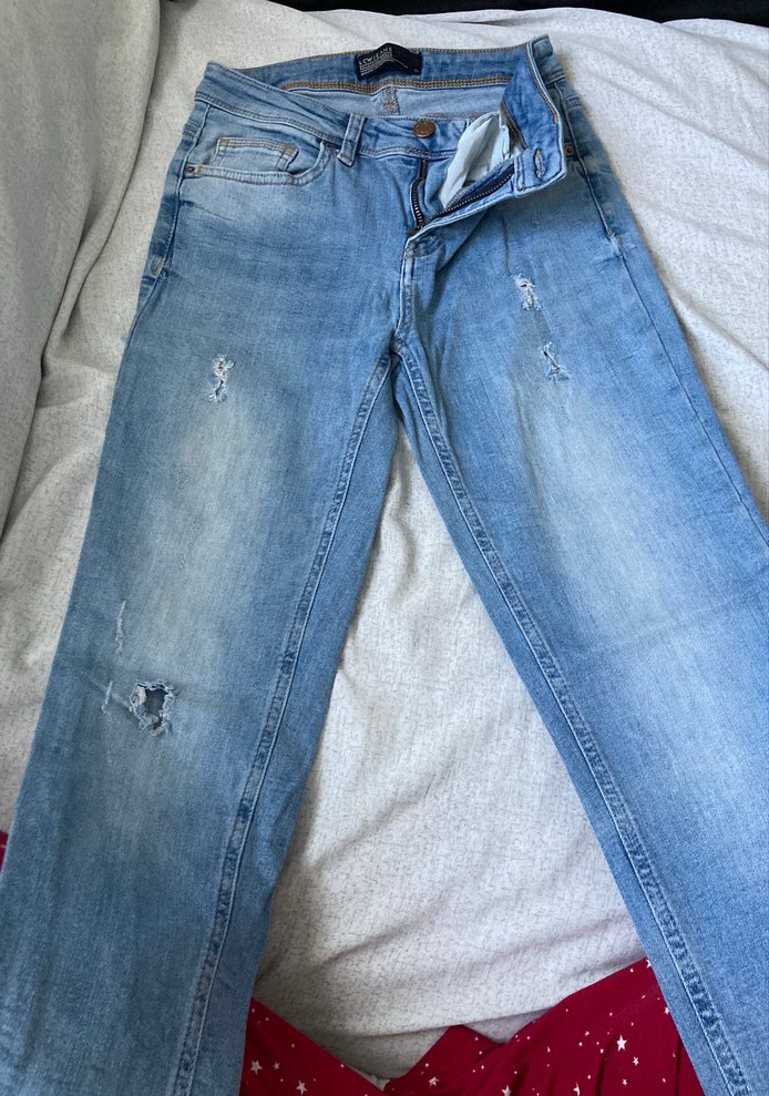 Gri mavi renkte, bol kesim ve midi boyda, tokalı detaylı kadın kot pantolon. Sokak stiline uygun, günlük kullanıma elverişli hafif yıpranmış görünüme sahip.
