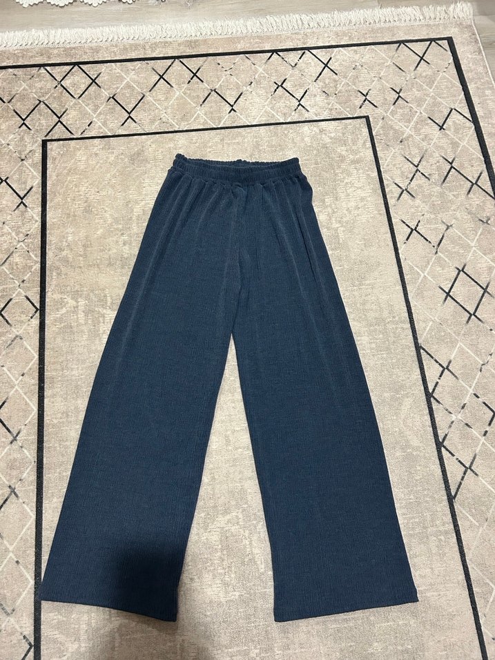 Gri-mavi renkte, bol kesim midi uzunluğunda, pile detaylı denim pantolon. Trendy ve rahat günlük kullanım için uygundur. Hiç kullanılmadı kendim dikiyorum