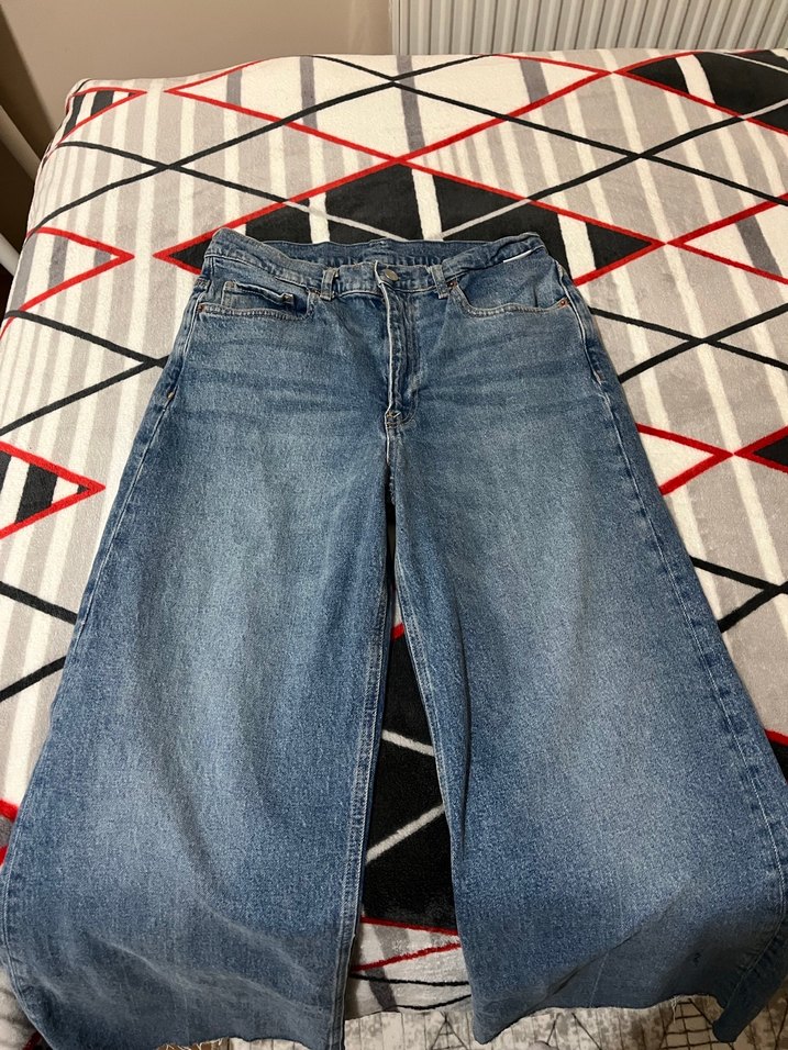 Gri mavi renkte, bol kesim midi uzunluğunda, tokalı kot pantolon. bedenime uymadığı için satıyorum hiç giyilmedi.