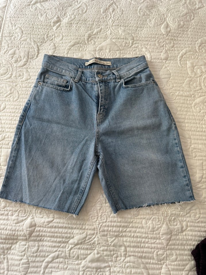Gri mavi tonlarında, bol kesim mini denim şort, günlük rahat kullanım için düz ve desensiz tasarlanmıştır.