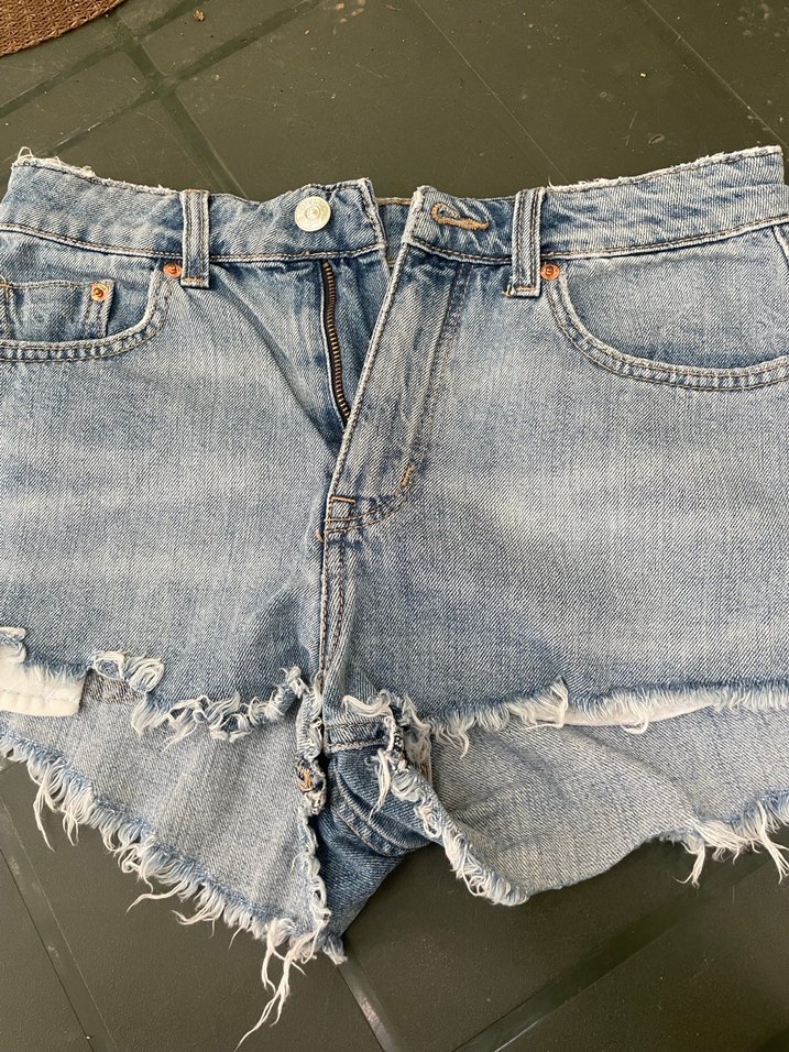 Gri-mavi renkli, düğmeli ve yıpranmış kenarlı bol kesim mini denim şort, gündelik kullanıma uygundur.